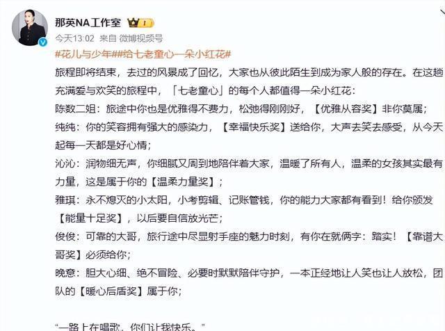 就在11.4号的时候那英的工作室发出了一则公告,因为花少7迎来了收官, 她的工作室发文告别,并且把每一个人的性格还有相处这么久的感受都说了出来,给每一个人都颁奖了,真不贴心的大姐姐不偏不向的。